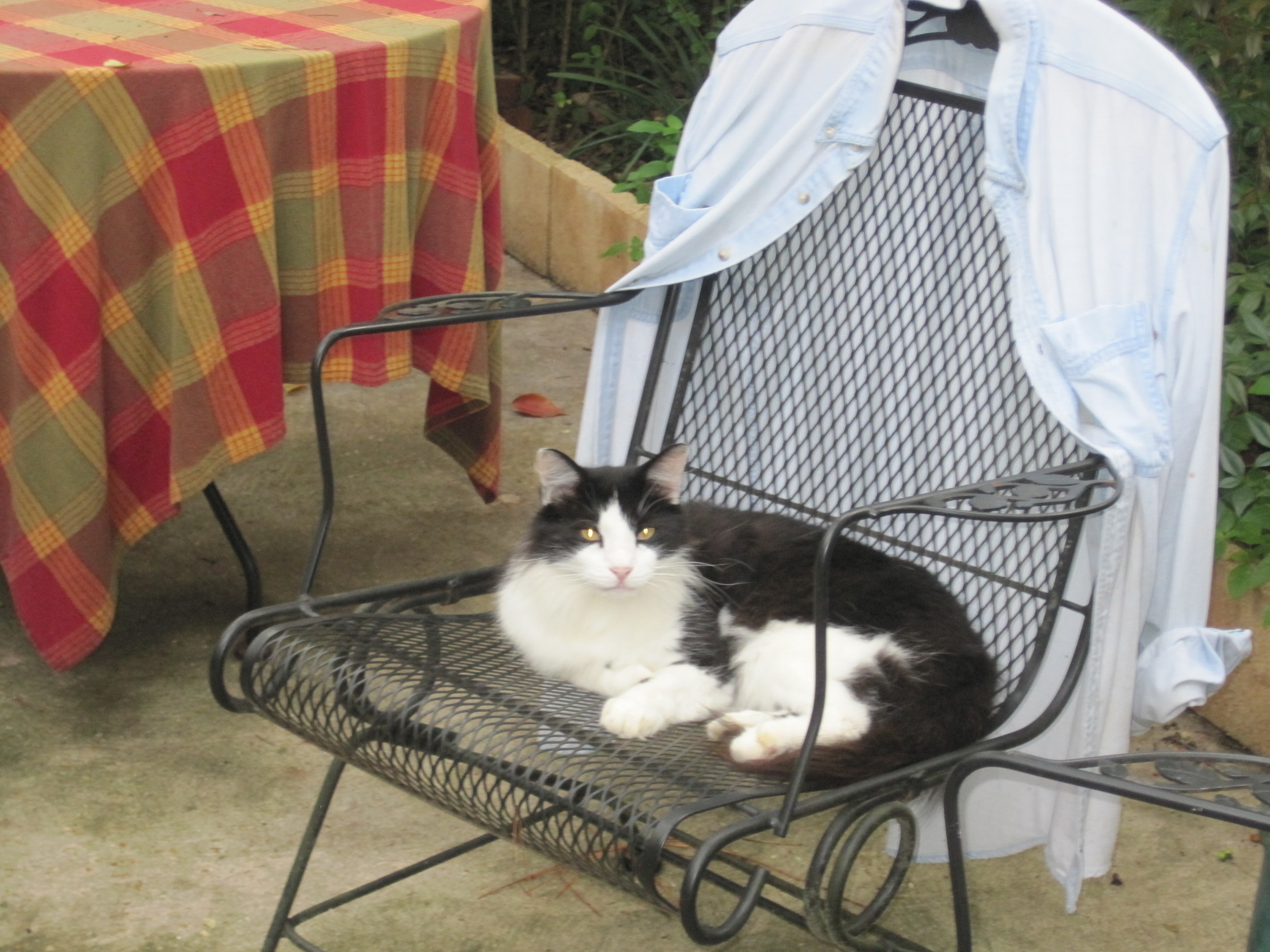 Meet Mr. Bojangles. This is my next door neighbor’s cat. He visits me, relaxes in my back yard, wanders through the gardens, eyes my birds, drinks water from the low bird baths and talks to me. The most frequent conversation that Mr. Bojangles has with me is when he says “feed me”. That is really the only conversation. So guess what? I feed him.