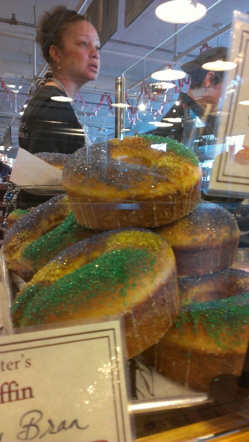 We had to have a piece of King Cake to celebrate Mardi Gras yesterday @ Atwater’s Market. No baby, just cake. Sprinkles on each piece, the Purple means Justice, Green means Faith and Gold means Power. I got mostly green sprinkles on my piece, but a little bit of gold and purple. I guess I’m covered.