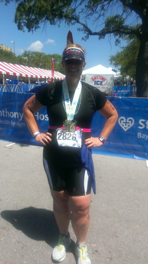 This is Jamie just as she came through the Finish Line at the St. Anthony’s Triathlon in St. Pete yesterday. This was her first Olympic distance triathlon. She finished strong, very strong. I am so proud of her. Doesn’t she look relaxed and refreshed?