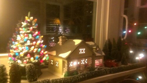 My mother loved Dept 56 Snow Villages.  They are bigger than the other Dept 56 series so I have a few of the snowy village buildings.  This one came out in ’97, a sweet bungalow with what looks like a ’50ish Dodge red station wagon parked in the garage.  The car has snow skies on top too ready to go.