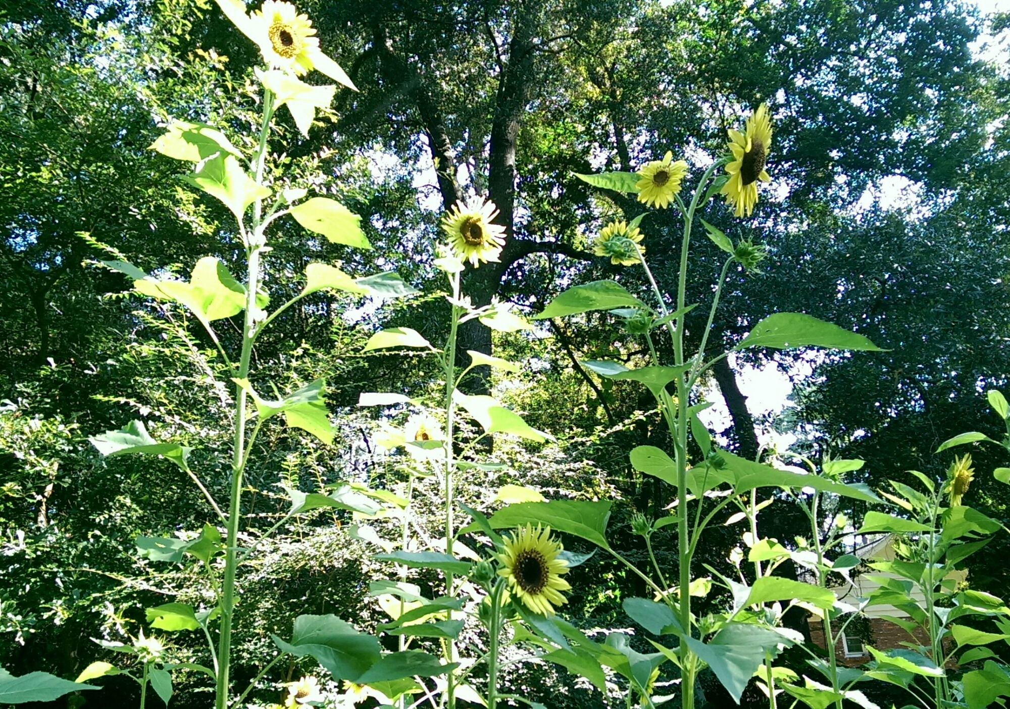 In my garden, I planted this precious small variety of sunflowers. They are growing between 7′ to 8′ tall and are so cute. This garden is on the back of my property, but I can see the flowers from my kitchen window, what a delight.