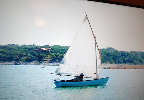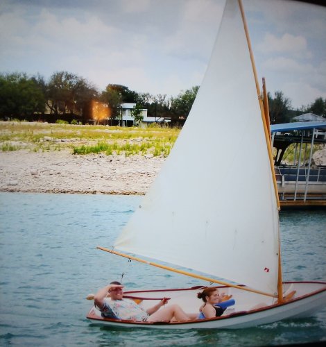 Above pic is Monte on the Catboat he built and finished in 2004. Below the dingy he built earlier, let’s all go sailing in these beautiful handmade boats, floating and playing in the cool water.