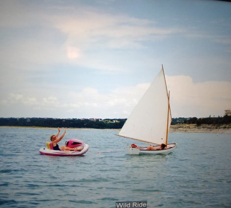 Laura sailing the dingy and pulling Momma on the inflated jet ski.