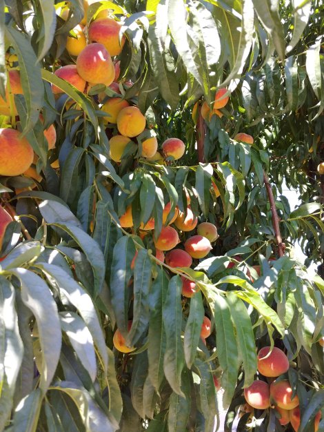 Fresh peaches are on their tree in the back yard in Sacramento. These peaches are not quite ripe but maybe in another week, please hurry I leave in a week.
