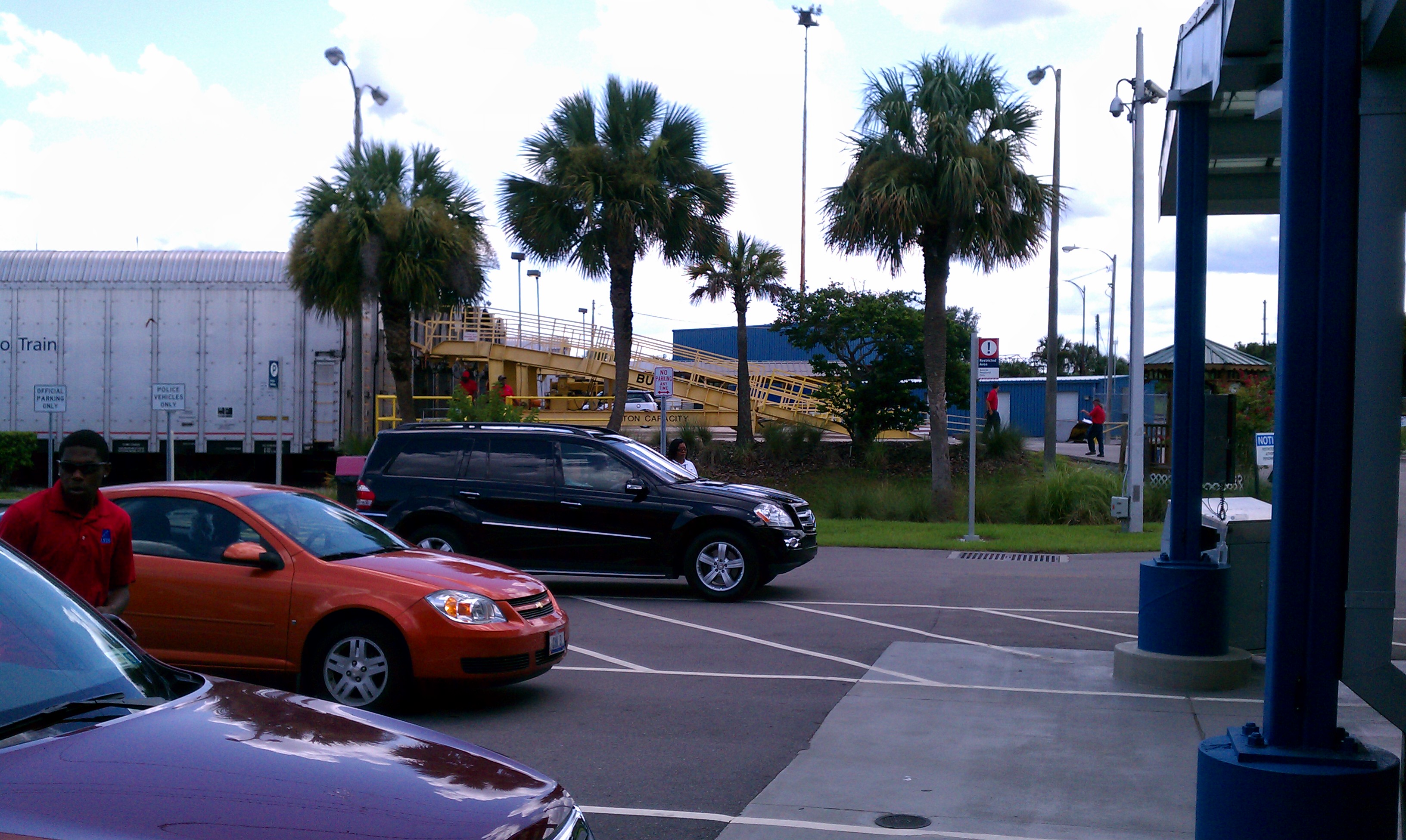 I checked in the Mini Cooper at the train station in Sanford, I took a few personal things with me and they drove my car on the Auto Train. You have to look close, but you can see the silver little car being driven on the lower yellow ramp. See it? Sixteen train cars held 170 vehicles on the trip. Since I was one of the first to check my car in, guess what? I was one of the last to get it. These cars were lined up for check-in.
